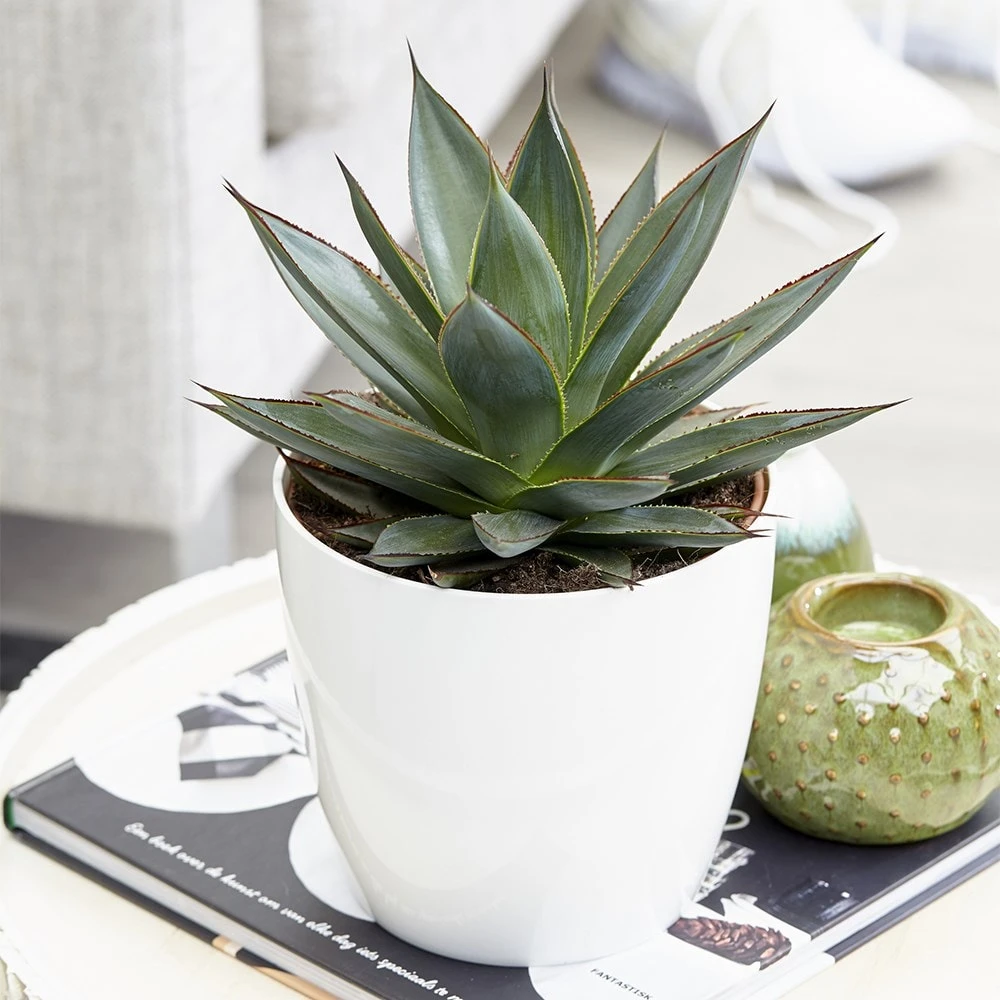 The fleshy blue-green leaves of this structural house plant have a sharp, pointed tip and jagged edges, which are also lined in reddish brown. A decorative plant, it looks great in a contemporary setting.