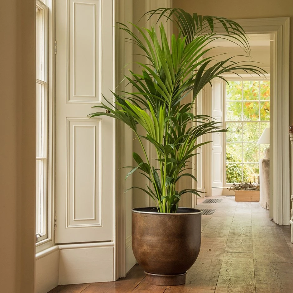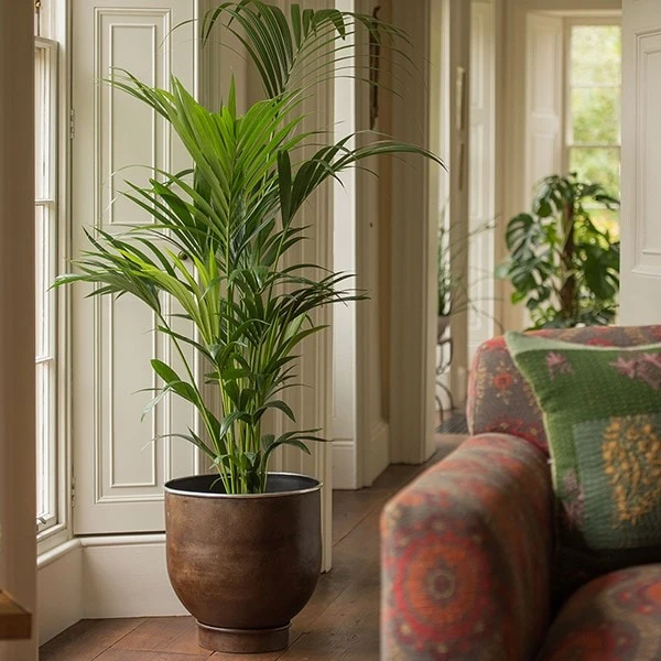 Tall aluminium cylinder with a conical base, finished in dark rust with a polished aluminium rim. Shown here with Howea forsteriana (sold separately).