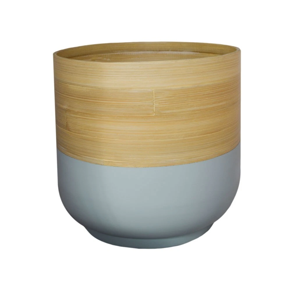 Handmade light and sturdy bamboo pot with a natural and light blue finish. Supplied without drainage holes for use as an indoor pot cover. Available in a choice of sizes.