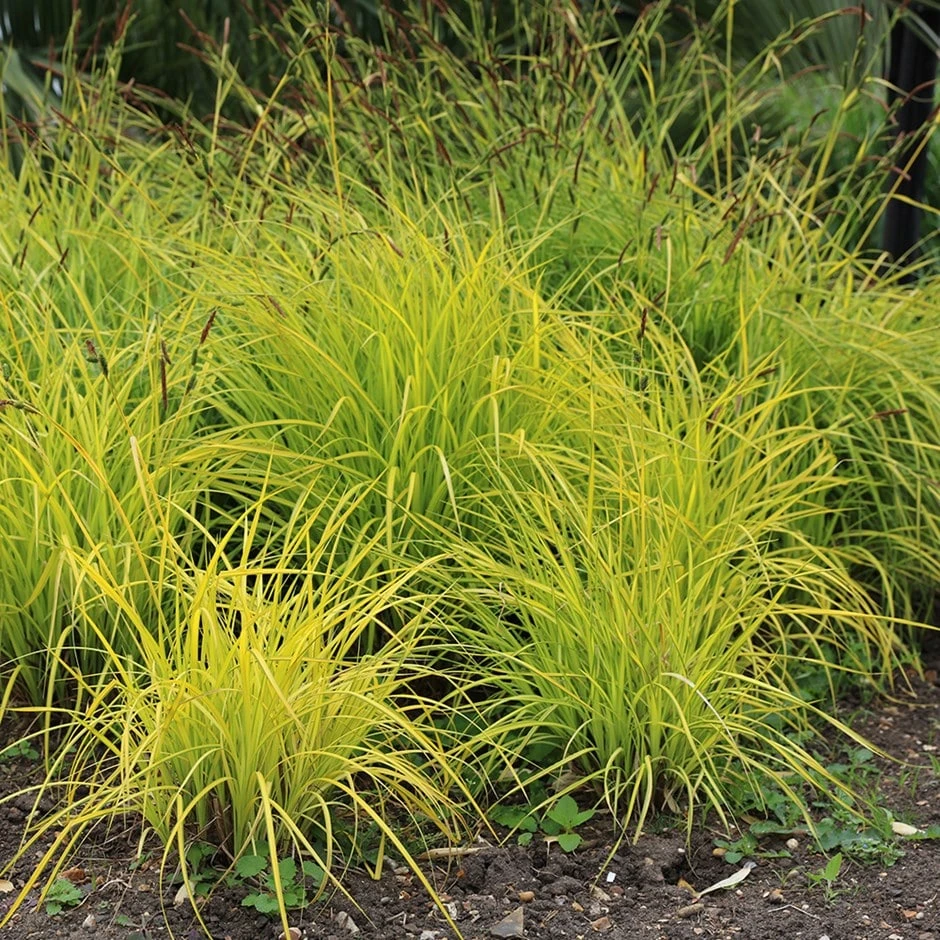 Named after the famous botanist and author, EA Bowles, (who discovered the native species in East Anglia), this gorgeous, semi-evergreen, ornamental grass forms tussocks of rich yellow leaves. It’s useful for brightening shady areas, filling gaps in borders, or planting by water, where its fine leaves will offer contrast and textural interest. If it is kept well watered, it will tolerate a spot in bright sun, however the leaf colour is at its best when it’s grown in partial shade. It is primarily grown for its attractive foliage, however in early summer, it will also produces long spikes with brown, feathery flowers.