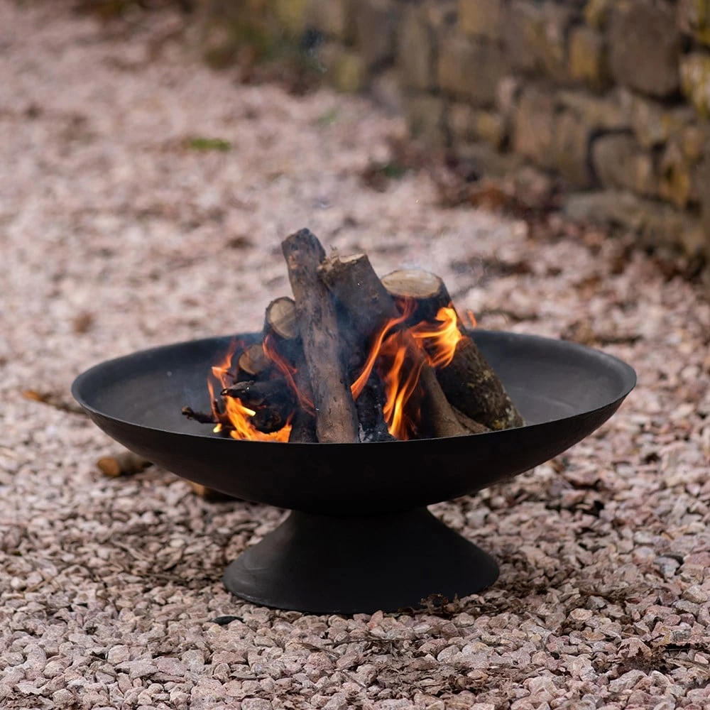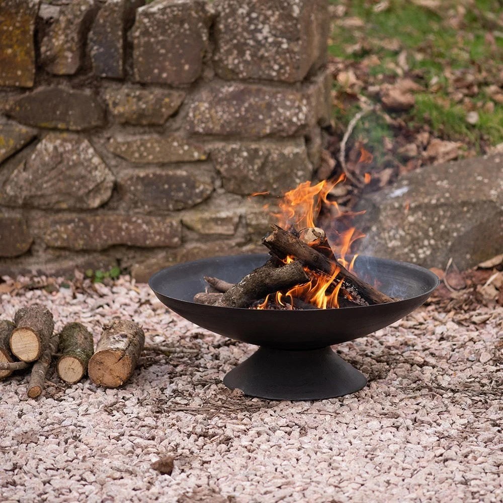 A magnificent cast iron bowl with a simple design, which will hold a good sized fire. It is made from heavy cast iron, approximately 5mm thick, so although it will show some signs of rust if left outside, it will never rust through completely. The black paint finish will burn off, along with any small spots of rust which will develop, but this bowl is built to last.