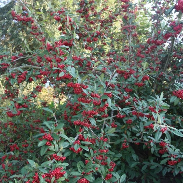 This vigorous, semi-evergreen shrub or tree bears clusters of small creamy-white flowers in June. These are followed by masses of almost spherical, bright red berries in late autumn. This fabulous autumn display corresponds with the normally deep green leaves taking on a bronze tint. This is an excellent specimen plant for a sunny spot, but it needs space to express itself. The berries are highly attractive to birds.