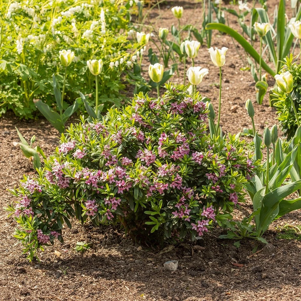 Daphnes do best, and prefer to be in the ground (rather than in containers), where they enjoy a deeper, cooler root run. Best in well-drained but moisture-retentive soil that contains plenty of organic matter, they won’t tolerate drought or waterlogging. Avoid excessive root disturbance during planting and keep pruning to a minimum since the plant is susceptible to die-back. Where necessary after flowering, lightly trim to remove misplaced branches in order to maintain a compact habit. Shelter from cold, drying winds. Cold hardiness can be improved by insulating the roots and soil surface with a thick (2in) layer of mulch and protecting foliage from severe or prolonged frost with a covering of horticultural fleece.
