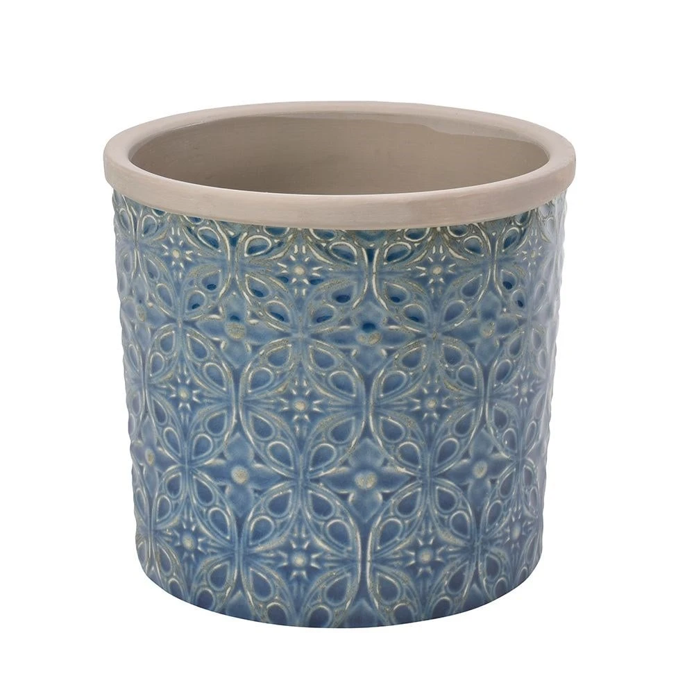 Mediterranean inspired blue ceramic pot cover for indoor use. Features a traditional embossed geometric pattern and water-resistant glazed finish. Supplied without drainage holes.