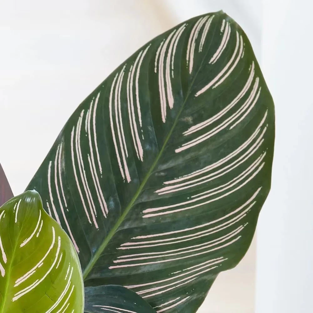 Foliage plants are very popular now for adding freshness and life to our homes. Whether they are displayed in a group or as a stand-alone feature plant, they can help to improve our wellbeing. This goeppertia, with its dramatic broad oval-shaped leaves, emerging bright green with pinky-white zebra stripes radiating out from the central vein, will certainly look good in any room. As the foliage matures the leaves deepen to dark green with striking white strips and a dusty pink underside.