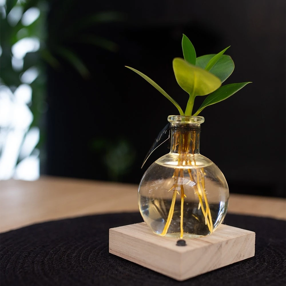 - Home care: Supplied as a rooted plant without water, simply fill with water on arrival and every few weeks replace the water to keep it fresh and the plant provided with nutrients. Small levels of micro and macro nutrients exist within the water so this should be sufficient. Eventually, the plant will outgrow the vase and a new cutting will need to be placed in it. The LED light is only for ambience and does not stimulate any growth, so we recommend placing it in a well-lit room. The product is only sold as a whole, and no replacement parts are available.