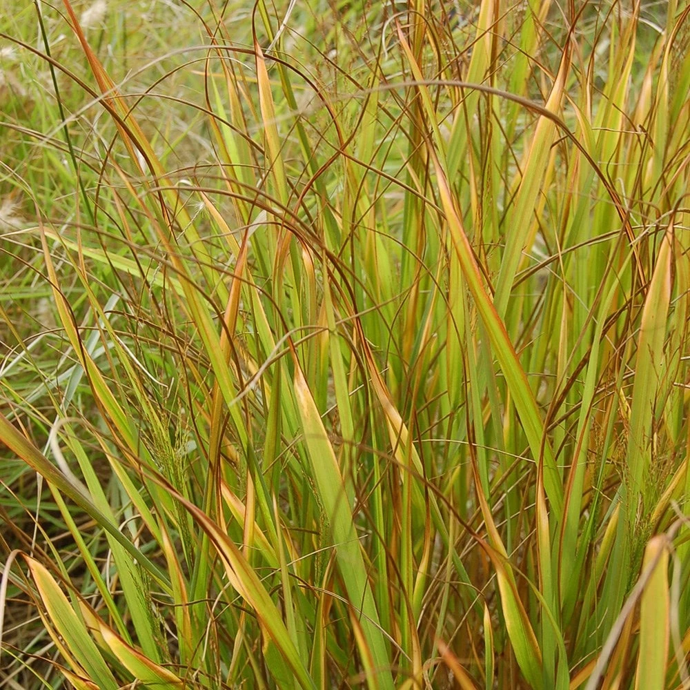 Free-flowering clump-forming upright grass with flat red-tinted leaves turning glowing red in autumn and weeping clusters of brown flower spikelets