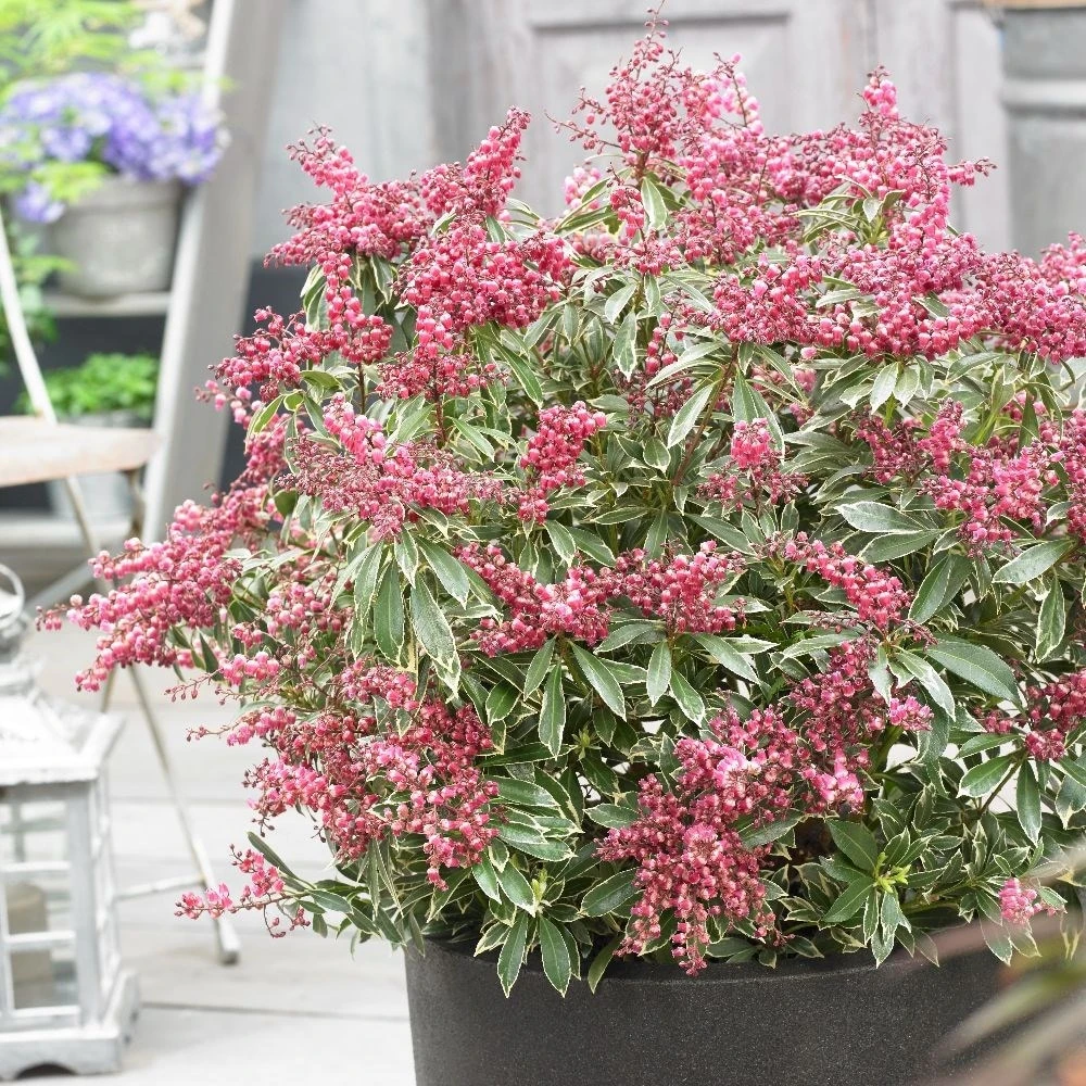 ‘Polar Passion’ has a profusion of pretty dusky pink flowers emerging from early to mid spring. Mid green leaves with slender cream margins provide an elegant background for this visually appealing shrub.