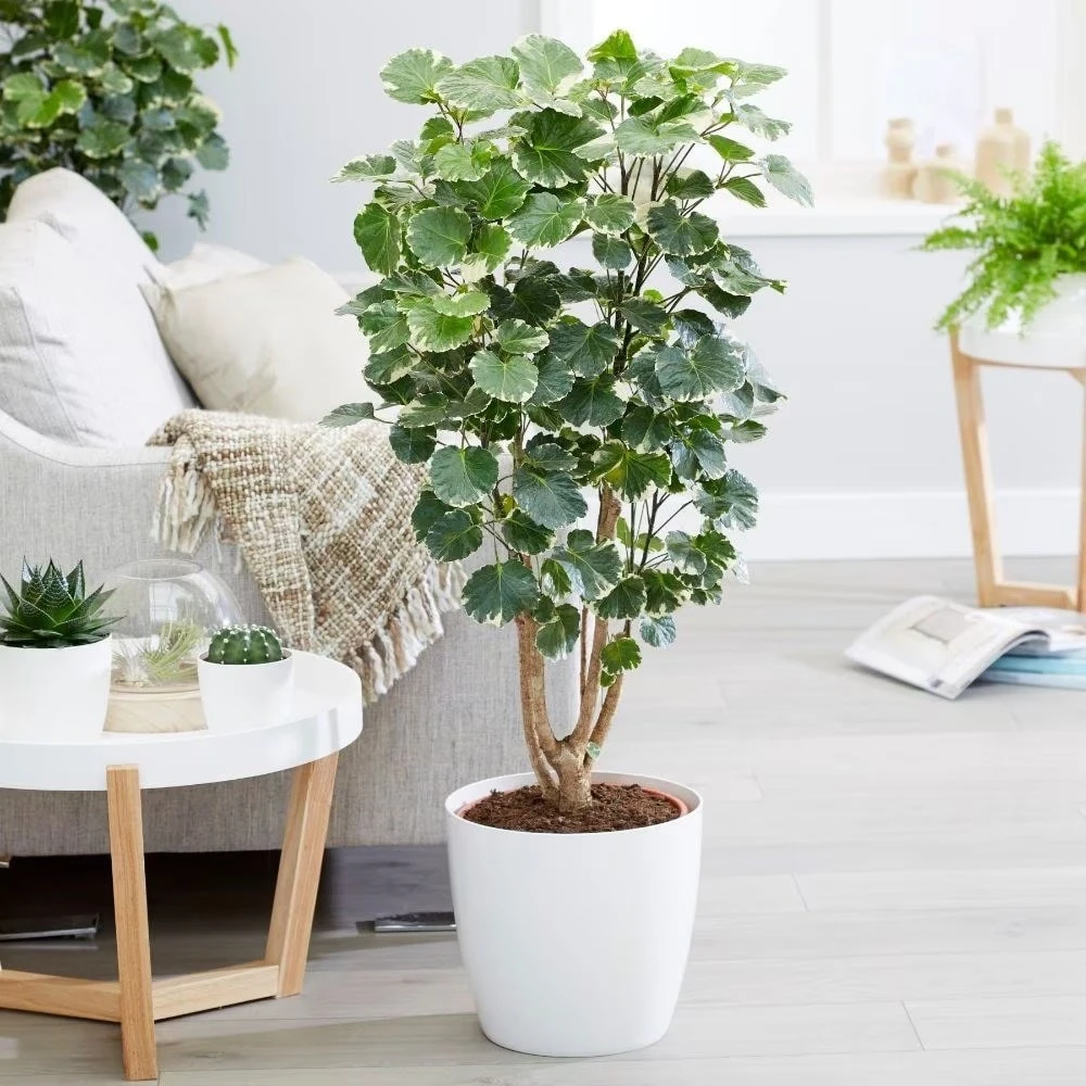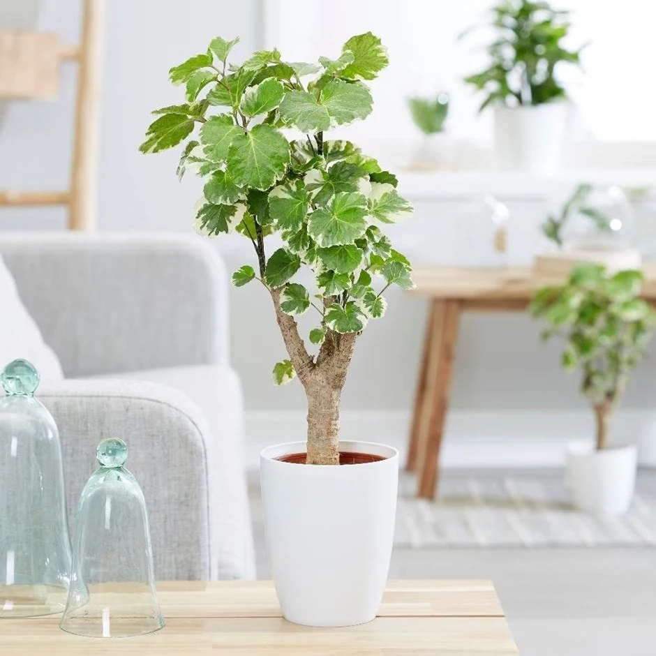 The rounded, lobed leaves of this striking house plant look a little like a geranium, but they have a leathery texture and an irregular creamy variegation. An excellent and unusual addition to the collection, it is mainly grown for its foliage, but every so often it may also produce airy sprays of greenish-yellow flowers.