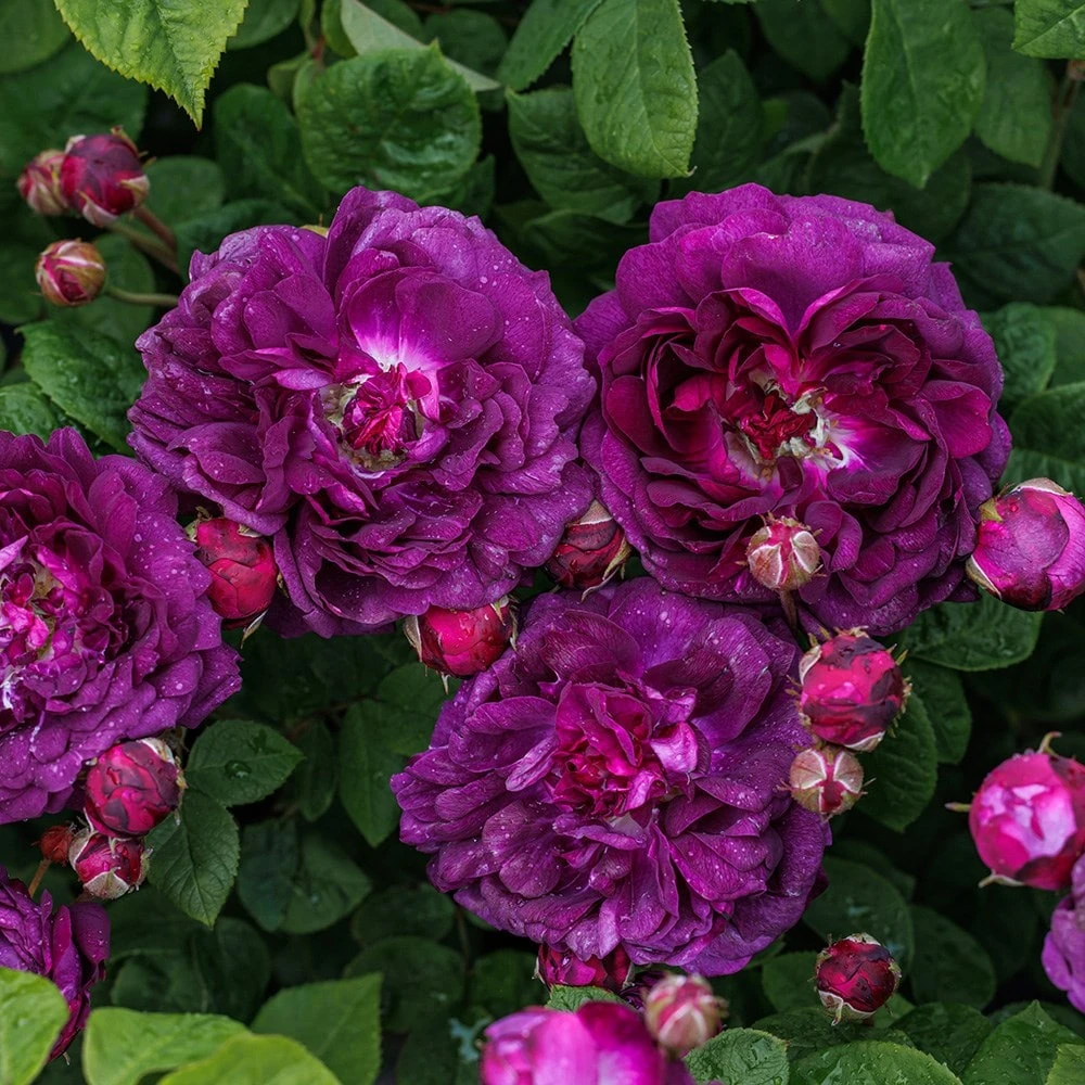 Dense clusters of sumptuous, fragrant, fully double, deep burgundy-purple flowers in June and July and dark green leaves. This gorgeous, gallica rose is an excellent specimen plant for a mixed or shrub border in sun or partial shade. On virtually thornless stems, the rounded blooms make exquisite cut flowers.