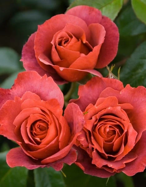 Voted ‘Novelty Rose of the Year 2006’ by the National Rose Society. From early summer rusty orange buds open to warm, smoky-brown roses, which have a good scent. They appear in trusses continually throught the season above the handsome, glossy foliage and look particularly good in ‘hot’ themed borders. As they are reasonably compact, they are also suitable for growing in a large pot on a sunny patio.