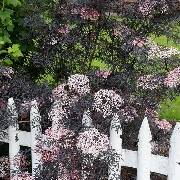 Striking almost black, dissected foliage and from May to June pale pink, musk-scented blooms emerge from beautiful creamy-pink buds. It makes an excellent shrub for all styles of gardens and has the added bonus of having blackish-red berries in autumn which are attractive to birds and when ripe can be used to make a wonderful wine. For best foliage colour grow it in full sun, otherwise it can fade to a greenish-bronze.