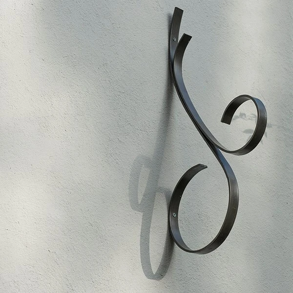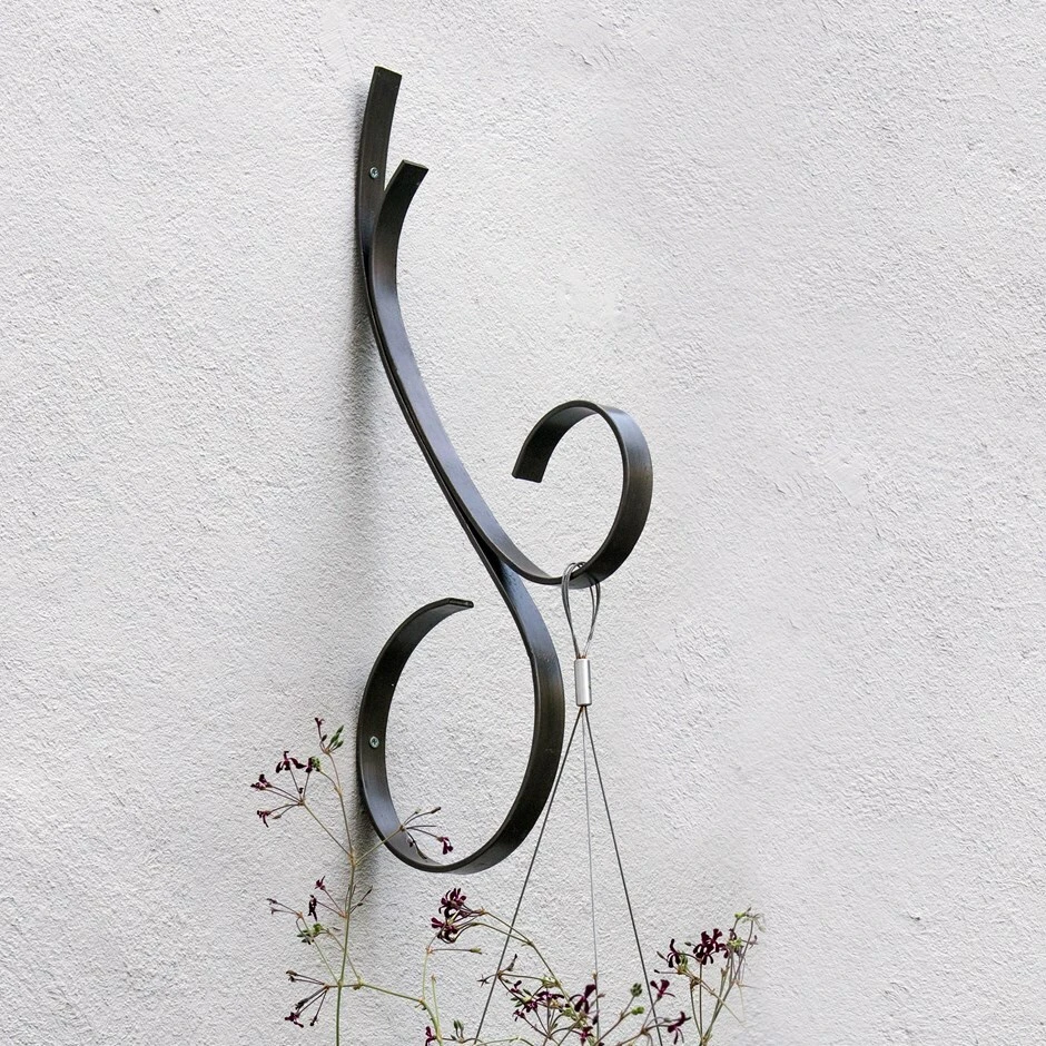 Inspired by classic wrought iron scroll garden benches, these striking hooks make a smart and practical choice for hanging pots and baskets, bird feeders, bee logs, wind spinners and more. Made from 5mm by 25mm steel bar with two fixing points and a matt powder coat finish. Suitable for indoor or outdoor use.