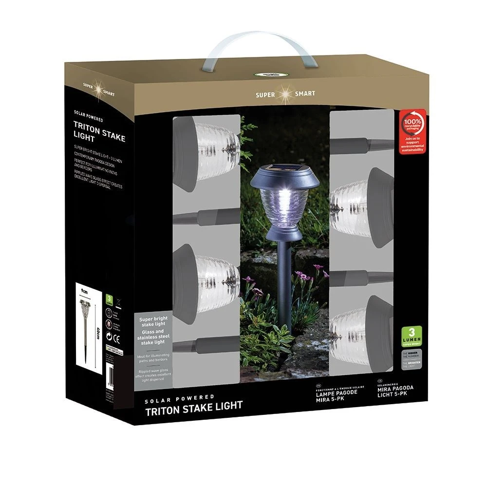 Set of 4 super-bright 10 Lumen solar stake lights with cool white LEDs. Ideal for highlighting the edges of borders, paths and driveways.
