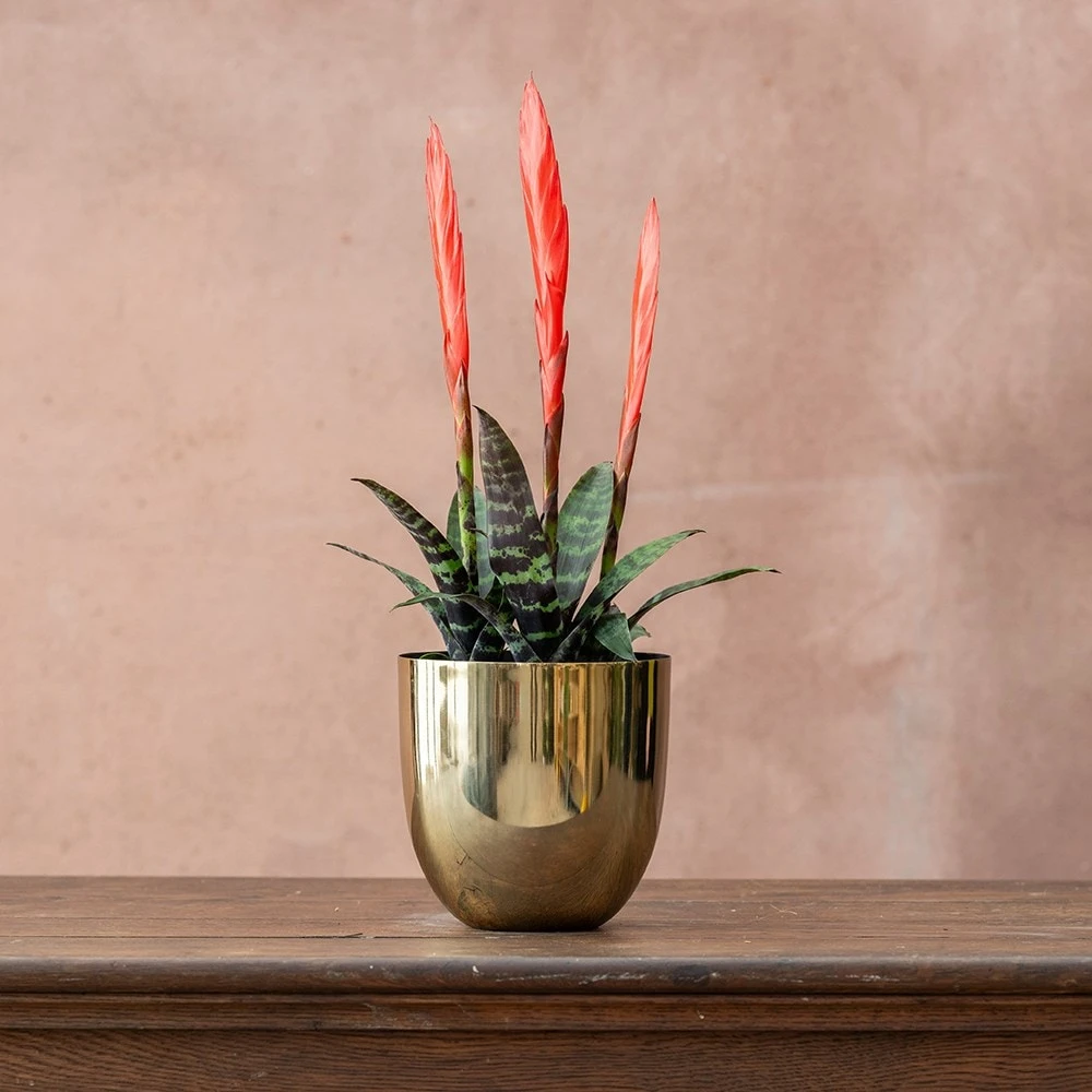 Leathery strap-shaped leaves that are irregularly striped with maroon-green form a funnel-shaped rosette, from which a luminous orange-red, spear-like raceme is jettisoned. The appearance of the flower usually signals the end of the individual rosette, however if you keep it in good conditions, you should soon find new shoots starting to appear from the base to take its place.
